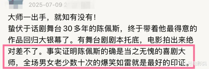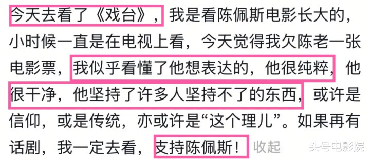 在点映路演现场,看到终于复出拍电影的陈佩斯,大家都很激动,纷纷夸电影《戏台》好笑,讽刺,精彩,高级,也盼望他保重身体,希望能继续在电影院看到他。